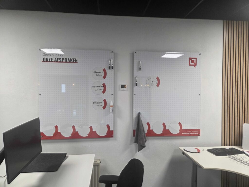 Tijdens de retrospective begeleidt de scrum master het proces en worden de verbeterpunten direct op het Visual Board geschreven. Iedereen die ons kantoor binnenloopt ziet meteen welke afspraken gelden en waar we als team aan werken. Het dient hierdoor ook als een praktisch scrum board voor onze dagelijkse operatie.